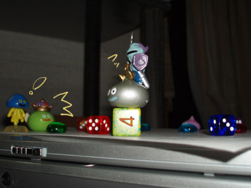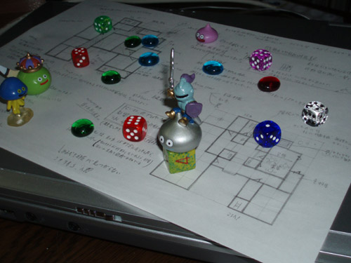 × [PR]上記の広告は3ヶ月以上新規記事投稿のないブログに表示されています。新しい記事を書く事で広告が消えます。 今回は、どんな風にTRPGのシナリオやクラブイベントを作っているのか?について語ろうかなぁ・・・・・・と思っていたけど、 むしろ、誰か教えてプリーズ!! (ノω`*)テヘ 写真は23日のTRPG用に走り書きしたダンジョンの内部構成図案。 もちろんのこと、プレイヤーを苦しめる罠の詳細もちょこちょこっとメモしてありますね。 実際、これはまだメモの段階なのでこれから煮詰めていくわけですが、とっても時間足りなさそう;; ついでに、罠のエッセンス要素も足りないYOKAN!! 散らばっているのはTRPGでよく使うコマのスライムたち。 これらはプレイヤーのキャラクター、敵モンスターの表示用に非常に役に立ちます。 私がプレイヤーを行うときはホイミンを愛用しており、日々人間になるための修行中ですw 写真の赤×2と緑のダイスを今まで使ってきたのですが、他の色も欲しいなということで、 先日新たにピンク、白(クリア)、ブルーを購入。 写真ではわかりにくいのですが、赤と緑のダイスにはラメ加工してあったりします。 派手ではない程度に☆キラキラ☆してるあたりがお気に入り。 TRPGでは、ダイスを何度も振ることで良い出目が出るようにダイスを育てるのが一般的で、 大抵の方が自分専用のMYダイスを持っていたりしますね! 人によってそのMYダイス、大きさも外観も形も違ったりするのがこれまた一興。 私の場合、比較的出目は1と6が多いかな? 複数振ったときの合計値がどうなるかで行動の成功失敗が決まるTRPGでは、結果が良い意味でも悪い意味でも惨劇になるほど。 その出目は他プレイヤーからは恐れられているという噂も。 楽しいからいいんですけどね! もちろん、大失敗でも! (*ノノ)キャw(コラマテ 探してみると、ダイスにもいろんな種類があって面白いですよ。 金銀銅のオリンピックダイスとか、7面!?ダイスとか、宇宙文字ダイスとかetcetc......。 興味があったらボードゲームなどのお店に行くと売っているかも。 おまけ。 写真の撮る角度を変えてみるとこんな感じ。 PR