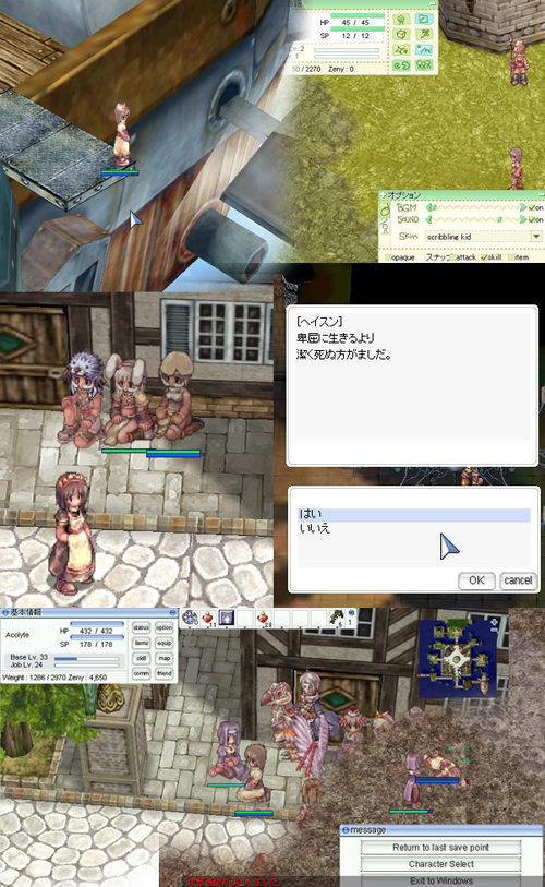 日付を確認したところ、2006年8月末・・・(ぁ まぁ、そんなこんなで一度ROを体験してみようとインストールなど。 少ない時間の割りに飛行船で移動してみたり、転職クエストとか色々やってみました~。 転職はアコライトに(性格診断受けたらアコライトだったので)。 ただ、TWのような2次元?で慣れすぎてしまっているせいか、3Dでの移動にかなり困惑しつつのプレイとなりましたが。 狩りが終わったあとは、いつも通りマッタリとチャットしつつ。 まぁ、おかげさまで今日だけで33レベルまでスクスクと育ちましたよ(ぇ 追伸~? ROの無料チケットもう1枚あるので、やりたい人がいましたらあげますよ~w